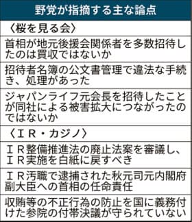 立民などは桜を見る会やIRを巡る問題を「政権の体質を象徴する問題だ」と位置づける。政権に不都合な情報を隠している点で学校法人「森友学園」「加計学園」問題と同根だと訴え、世論の支持に期待する。