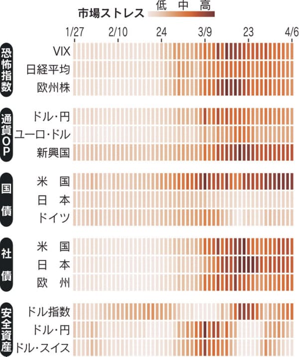 新型コロナウイルスまん延による景気低迷懸念から、世界の金融市場で緊張感(ストレス)が高まってきた。そこで投資家の不安心理や景気動向を反映しやすい15の指標を元に「市場ストレスマップ」を作成した。色の濃さは緊張感の高まりを示す。