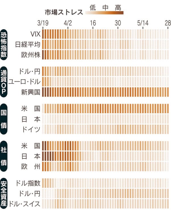 世界株安が進み市場のストレスがピークに達した3月中旬以降、米連邦準備理事会(FRB)による資金供給策などを背景に過度な警戒ムードは後退した。株式市場では経済活動再開に伴う景気の底入れやワクチン開発への期待が広がり、社債市場では資金繰り不安の後退で緊張感の緩和が進んでいる。一方、感染第2波への警戒感や米中対立への懸念も根強い。各国の経済対策や金融政策でストレスが一段と緩和されるかが注目される。