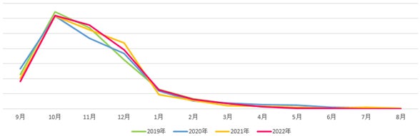 各年、出発月の割合に大きな変化がございませんが、世界的にコロナの感染者が増加しつつあった2020年11月~2021年初旬は、感染に関わる情報が今より不明確な状況であったこと、航空会社の運航が流動的であったことも相まって、早期予約が難しく、国内および旅先の様子をみて間際で予約せざるを得ない状況であったことが伺えます。今年は間際の予約に集中することはなく、2・3か月先のご予約が主流になっております。国際線の運航再開など、先の予約が立てやすい環境に戻ってきたことが要因と考えられます。