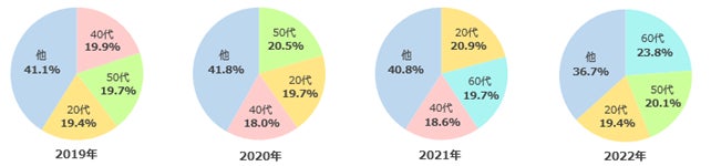 割合としては各年代大きな差は出ておりませんが、レジャーが回復しつつある今年はエルダー層(50代・60代)の動きが活発です。男女比はどの年もほぼ半々~女性の比率が若干高い傾向がありますが、今年3番目に多い20代は、女性が約68%と他の年代より女性比率が大きいのが特徴です。