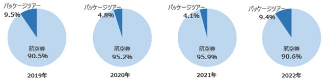 一人旅でのパッケージツアー利用の場合、宿泊ホテルにて一人部屋追加代金が必要になることから、航空券単品または航空券とホテルを個別に購入される方が多くいらっしゃいます。2019年の比率と今年の比率は同程度であり、商品ニーズはコロナ前に戻っております。