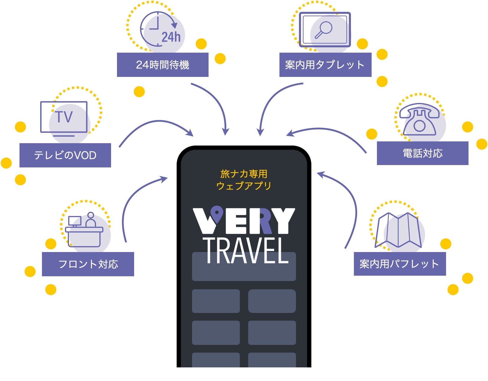 『VERY』は、当社の既存のサービスである『talkappi』の各種機能を、導入宿泊施設専用の旅ナカアプリとして一括表示するものです。これにより、多言語チャットボットの自動応答をはじめ、館内案内・周辺案内の自動化、各種サービスの予約と決済までをシームレスに完結することができます。予約機能は周辺観光施設に管理画面を提供することにより、宿泊施設外の対応も可能です(当社が旅行業登録をしておりOTA形式での送客も可能)。アンケート、SNS連携や会員機能の他、ユーザーのアプリ操作や問合せ内容から予約に至るコンバージョンを蓄積し、導入施設のマーケティング活用も可能です。