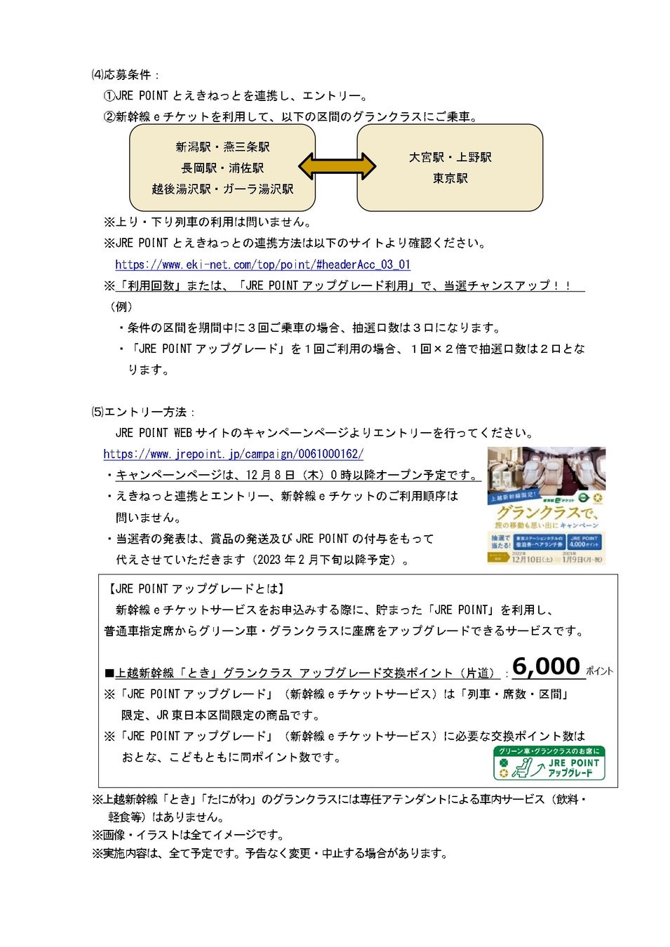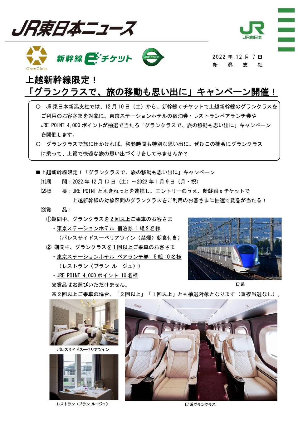 JRE POINTとえきねっとを連携し、エントリーのうえ、新幹線eチケットで上越新幹線の対象区間のグランクラスをご利用のお客さまに抽選で賞品が当たります。